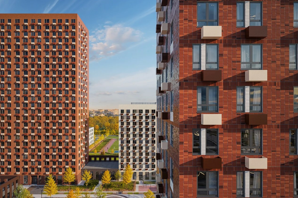 Корпуса проекта высотой от 11 до 28 этажей разделены на графичные объёмы. У самой высокой башни-доминанты — необычный фасад со ступенчатой вершиной.